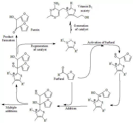Furoin synthesis from furfural is also catalyzed by vitamin B1 (thiamine). In 1957, Ronald Breslow proposed that this reaction involves a relatively stable carbene form of thiamine.[2][3] In the catalytic cycle shown below two molecules of furfural react to give furoin, via a thiazol-2-ylidene catalyst, resulting from loss of one proton at carbon 2 of the thiazolium cation of vitamin B1: