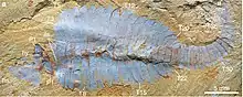 Complete Fuxianhuia specimens are approximately 4 centimetres long. The anterior of Fuxianhuia is encased in an oval sclerite, from which two stalked eyes emerge. Inserting directly behind this sclerite, on the head shield proper, are two stout antennae. When the head of Fuxianhuia was originally described, two additional head appendages, the "sub-chelate" pair were also described.[2] These are geniculate, backward-pointing appendages that lie in a highly stereotypical position (i.e., their position does not vary much from one specimen to another). Partly because of this, and partly because of their rather indistinct morphology, their status as appendages has been questioned. Indeed, on the grounds that these structures seem to lie between two cuticular layers, Waloszek and colleagues have suggested that they are not appendages at all, but rather gut diverticula;[3] a reassignment that has however not been universally accepted.[4] Ventrally, a large plate has been interpreted as a hypostome.