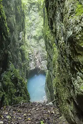 Gabzaruli Tba Natural Monument also known as Cracked Lake Natural Monument (Georgian: გაბზარული ტბა) is a small siphon lake in Georgia region Imereti, Tskaltubo Municipality, in the village Kumistavi, 166 meters above the sea level.[1] The villagers also call it Tskrvaram.[2] Gabzaruli Tba or Cracked Lake is about 5 m long, 4.5 m wide and 60 m deep. The siphon lake is part of unexplored cave system and lies in a 45 m deep canyon created by tectonic rupture. Steep canyon slopes are covered with deciduous forest. Villagers use lake water for drinking and also do fishing and swimming in the lake.[3]