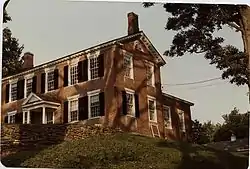 Forty handmade window sashes with 12-over-12 lights, based on one original in the house, were expertly handmade by restoration craftsman, Jerry Bates, and installed with brass runners. Reproduction historic wallpapers were used throughout, including Williamsburg patterns of the period in the front stairwell. Historically documented antique reproduction handmade lighting fixtures from Ball and Ball[27] in Pennsylvania were installed in the stairwell and other rooms. An entire new kitchen was installed, and the ceiling in the wooden ell at the back of the house was removed creating a cathedral ceilinged family room with loft. Bathrooms were completely replaced. Reproduction draperies from museum patterns were custom made for each room by historic fabric specialist, Lael Livak. Fine interior custom carpentry was by Sandy Packard. Plastering was done by Vermont's veteran master-plasterer, Willy Verchereau.(Restoration details are from flyer printed for house tour in 1982.)[28]