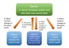 A game client is a network client that connects an individual user to the main game server, used mainly in multiplayer video games. It collects data such as score, player status, position and movement from a single player and send it to the game server, which allows the server to collect each individual's data and show every player in game,[1] whether it is an arena game on a smaller scale or a massive game with thousands of players on the same map. Even though the game server displays each player's information for every player in a game, players still have their own unique perspective from the information collected by the game client, so that every player's perspective of the game is different, even though the world for every player is the same. The game client also allows the information sharing among users. An example would be item exchange in many MMORPG games where a player exchange an item he/she doesn't want for an item he/she wants, the game clients interconnect with each other and allows the sharing of information, in this exchanging items. Since many games requires a centralized space for players to gather and a way for users to exchange their information, many game clients are a hybrid of client-server and peer-to-peer application structures.
