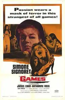 Games is a 1967 American psychological horror film directed by Curtis Harrington, and starring Simone Signoret, James Caan, and Katharine Ross. Its plot follows two jaded Manhattan socialites who engage in a series of mind games with a German cosmetics agent whom they invite into their home.