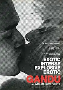 Gandu is a 2010 Indian erotic black-and-white art drama film directed by Qaushiq Mukherjee.[1] It features Anubrata, Joyraj, Kamalika, Silajit, and Rii in the lead roles. The film's music is by the alternative rock band Five Little Indians.[2] Gandu previewed at Yale University before making its international premiere on 29 October 2010 at the 2010 South Asian International Film Festival in New York City.[1] Gandu was an official selection at the 2011 Berlin International Film Festival and was also screened at the Slamdance Film Festival.[3]