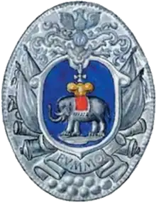 In an official document that Gannibal submitted in 1742 to Empress Elizabeth, while petitioning for the rank of nobility and a coat of arms, he asked for the right to use a family crest emblazoned with an elephant and the mysterious word "FVMMO", which may mean "homeland" in the Kotoko language. In his book, Gannibal: The Moor of Petersburg, Hugh Barnes writes of meeting with the sultan of Logone-Birni, who gave him the same translation of the word.[3] However, Frances Somers-Cocks, author of The Moor of St Petersburg: In the Footsteps of a Black Russian, met the same sultan and received a different translation for FVMMO. She also suggested that FVMMO stands for the Latin expression Fortuna Vitam Meam Mutavit Omnino which means "Fortune has changed my life entirely."[3]
