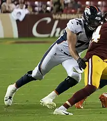 Bolles was selected by the Denver Broncos in the first round (20th overall) of the 2017 NFL Draft.[19] On May 11, 2017, Bolles signed a four-year, $11.01 million contract with $8.59 million guaranteed and a signing bonus of $6.16 million.[20][21] Bolles opened all 16 games at left tackle to represent just the fifth time in team history a rookie left tackle started every game since starting lineups were tracked beginning in 1968.[2] Bolles earned all-rookie honors from the PFWA, and was the sixth rookie to open the season at left tackle for the Broncos in Week 1.[22]
