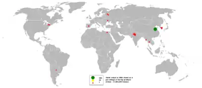 Garlic production in China is significant to the worldwide garlic industry, as China provides 80% of the total world production and is the leading exporter.[1] Following China, other significant garlic producers include India (5% of world production) and Bangladesh (1%).[2] As of 2019, China produced 23 million tonnes annually.[2]