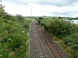 The OS maps of 1895 shows only a signal box and signals at the location.[6] By the 1920s only minor infrastructure was present as might be expected at such a remote location with the double track main line, one siding running off to a loading dock to the west, a weighing machine, small buildings and an access off the B744 road to Crosshands with a road over bridge.[7] The signal box or cabin was situated on the eastern side of the main line[8] with several semaphore signal posts and cross over points were present[9] with runaway points located in the up line about 400 yards (370 m) towards Hurlford from the signal box.[10] In 1898 the signal box was staffed day and night during the week and from 7.30am to 8pm on Sundays.[8] The G&SWR Permanent Way Department was responsible for the cleaning of the points and signals rather than staff from Mauchline railway station.[11]