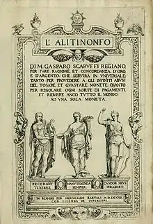 - ↑ L'alitinonfo di m. Gasparo Scaruffi regiano, per fare ragione, et concordanza d'oro, e d'argento; che seruirà in vniuersale; tanto per prouedere à gli infiniti abusi del tosare, et guastare monete; quanto per regolare ogni sorte di pagamenti, et ridurre anco tutto il mondo ad una sola moneta. In Reggio: Hercoliano Bartoli. 1582. Retrieved 29 January 2018 – via Google Books.