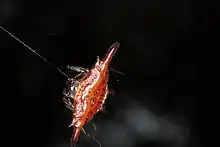 Females of the species have very wide abdomens, much wider than long, giving them a horizontal appearance that is further accentuated by their spines. They have three pairs of spines on the abdomen. The first (anterior) pair is usually small and conical. The second (median) pair is long and strong, generally horizontal but often curving slightly backward and downward or even slightly forward. The hind pair of spines is always well-developed and intermediate in length between the first two pairs.[2] Adult females are usually dark red[3] or brown and can show pale yellowish or whitish stripes horizontally across the upper surface of the abdomen[2] (example from Thailand).