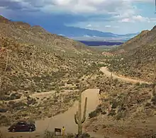 Gates Pass is a mountain pass along the crest of the Tucson Mountains. The road through the pass is a scenic route west of Tucson, Arizona. The road from the east is West Anklam Road which merges with West Speedway Boulevard in the city just east of North Camino De Oeste. West of the pass the road is known as Saguaro Road and continues until it reaches Kinney Road just north of Old Tucson.[2][3] The elevation of the pass is 3,172 feet (967 m).[2]