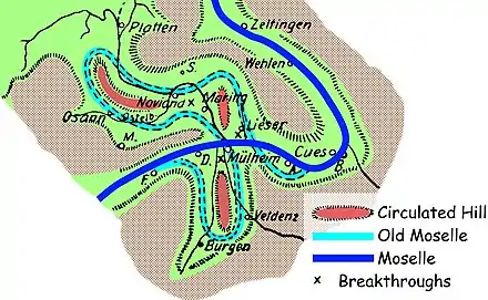 From the Quaternary onwards, the Moselle formed Meander in an originally flat plain with a balanced, flat undulating relief and cut progressively into today's narrow valley. At the beginning of the Upper Middle Terrace period, the Geisberg was a peninsula in a Moselle meander. On the west side of the mountain, the Moselle turned south, deviating from today's course, and turned in a loop near Burgen village back north and further along the east side. The Moselle continued flowing across the today's course past the Brauneberg mountain, and further in a north-westerly direction through the valley of Osann-Monzel into the Wittlich Depression. There it turned back south and reached in Lieser the current course of the river again, at 2 to 3 km from the point where these bends began. At the time of the Lower Terrace, a first breakthrough of the Moselle took place on what was then an impact slope near today's Mülheim. Further breakthroughs followed at the villages of Noviand and Maring. The Geisberg became the first and oldest circulating mountain in this area, before the Noviander Hüttenkopf and the Maring Mountain. Today the rivulets Frohnbach and Veldenzer Bach are flowing through the former Moselle valley at the Geisberg. Both come from the Hunsrück and had to relocate their estuaries after the Moselle had taken another course.[2]