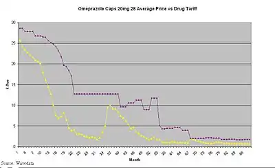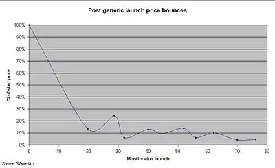 Generic pharmaceutical price decay is what happens (in the UK) once the originator brand has lost its patent exclusivity (patent expiry) and generic versions of the originator brand have been launched.[1][2][3][4][5][6]