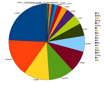 A study published by the National Academy of Sciences found that "the paternal gene pools of Jewish communities from Europe, North Africa, and the Middle East descended from a common Middle Eastern ancestral population", and suggested that "most Jewish communities have remained relatively isolated from neighbouring non-Jewish communities during and after the Jewish diaspora".[64][65] According to geneticist Doron Behar and colleagues (2010), this is "consistent with a historical formulation of the Jewish people as descending from ancient Israelites". Approximately 35% to 43% of Jewish men are in the paternal line known as haplogroup J and its sub-haplogroups. This haplogroup is particularly present in the Middle East, North Africa, Horn of Africa, Caucasus, as well as in Southern Europe.[66] 15% to 30% are in haplogroup E1b1b (or E-M35). Using Y-chromosome DNA from male Jews, a study sought to trace the patrilineal lineage of Jewish priests (Cohanim). Results revealed a common ancestral Y-chromosomal haplotype around 2650 years ago, possibly linked to the historic events of Jerusalem's First Temple destruction in 586 BC and the dispersion of the priesthood.[67] Studies of mitochondrial DNA of Jewish populations are more recent, debatable, and more heterogeneous.[68][69]