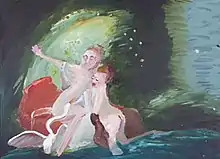 Figgis painted a version of Leda and the Swan in 2018 after an earlier work by François Boucher. Figgis’ contemporary version reinvents an idyllic romantic scene of lavish playfulness with a dark humor creating a scene of profanity and horror.[17][8][18]