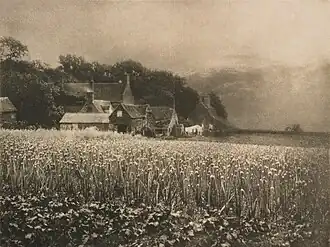 However, Davison experimented with techniques and processes, and soon turned away from naturalistic photography. He started to use a pinhole camera as one of the first pictorialistic photographers.[3] He made a picture called The Onion Field (originally named An Old Farmstead) in 1890, without sharp outlines on a rough paper, giving the effect of painting. It is considered as the first impressionistic photograph.[4][5] Nevertheless, Davison's photographs became a subject of polemics and controversy in the Royal Photographic Society. He decided to leave the society and to establish a new organisation, the Linked Ring Brotherhood, together with other followers in 1892.[3]