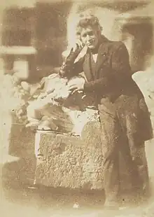 Kemp's brother-in-law, William Bonnar, painted at least two portraits of him. One, with the half-built Monument seen behind Kemp, is in the possession of the Scottish National Portrait Gallery.[16] The second portrait by Bonnar is owned by the City of Edinburgh Council.[17] A portrait by an unknown artist of Kemp holding a model of the Scott Monument also belongs to the City of Edinburgh Council.[17] Three sculpted representations of Kemp exist: a bust modelled from life by Alexander Handyside Ritchie and carved in marble by John Hutchison, is in the care of the City of Edinburgh Council;[17] a profile, also by Ritchie, adorns Kemp's tombstone in St Cuthbert's churchyard.[7] A further profile by Ritchie, in bronze, forms the centrepiece of the Kemp memorial at Redscarhead.[18] Two photographic portraits of Kemp, posed on the Scott Monument's building site, were made by David Octavius Hill in 1843. Salted paper prints from paper negative images are preserved by the City of Edinburgh Council.[17]