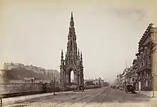 The foundation stone was laid on 15 August 1840, the 69th anniversary of Scott's birth, the day being especially declared a public holiday. Tens of thousands of people were present at the ceremony and Kemp was prominent among those being celebrated.[10] As work progressed over the next four years, Kemp's presence on the building site, visible daily to passers-by on Princes Street, probably contributed to his growing public popularity. With the public interest in the Scott Monument, Kemp was now admired by the moneyed and influential classes in Edinburgh, and several potentially lucrative architectural commissions came his way.[2]