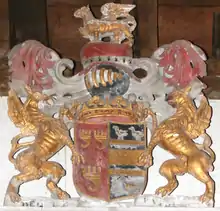 Heraldic achievement of Sir Bevil Grenville atop his monument in Kilkhampton Church, displaying arms of Grenville (Gules, three clarions or) impaling Smith of Exeter (Sable, a fess cotised between three martlets or)[12]