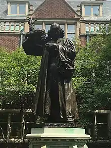 Franklin was an ecumenist and approved of Whitefield's appeal to members of many denominations but unlike Whitefield was not an evangelical. He admired Whitefield as a fellow intellectual, and published several of his tracts, but thought Whitefield's plan to run an orphanage in Georgia would lose money. A lifelong close friendship developed between the revivalist preacher and the worldly Franklin.[44] True loyalty based on genuine affection, coupled with a high value placed on friendship, helped their association grow stronger over time.[45] Letters exchanged between Franklin and Whitefield can be found at the American Philosophical Society in Philadelphia.[46] These letters document the creation of an orphanage for boys named the Charity School. In 1749, Franklin chose the Whitefield meeting house, with its Charity School, to be purchased as the site of the newly-formed Academy of Philadelphia which opened in 1751, followed in 1755 with the College of Philadelphia, both the predecessors of the University of Pennsylvania. A statue of George Whitefield was located in the Dormitory Quadrangle, standing in front of the Morris and Bodine sections of the present Ware College House on the University of Pennsylvania campus.[47] On 2 July 2020, the University of Pennsylvania announced they would be removing the statue because of Whitefield's connection to slavery.[48]