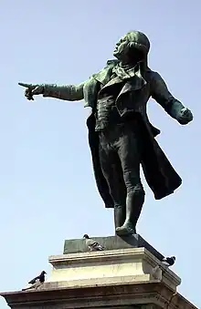 While the Committee of Public Safety was concerned with strengthening the centralist policies of the convention and its own grip over that body, Danton was in the process of devising a plan that would effectively move popular sentiment among delegates towards a more moderate stance.[48] This meant adopting values popular among the sans-culotte, notably the control of bread prices that had seen drastic increase with the famine that was being experienced throughout France. Danton also proposed that the Convention begin taking actions towards peace with foreign powers, as the committee had declared war on the majority of European powers, such as Britain, Spain, and Portugal. Danton made a triumphant speech announcing the end of the Terror.[49] As Robespierre listened, he was convinced that Danton was pushing for leadership in a post-Terror government. If Robespierre did not counter-attack quickly, the Dantonists could seize control of the National Convention and bring an end to his Republic of Virtue.