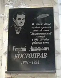 - In November 2003, on anniversary of Kostoprav's birth, a commemorative plaque was placed in Mariupol on the building, where once has been located the editorial of the Rumeika Greek newspaper Kolechtivistis (Miru avenue, 35).[18] Judging by recent footage from the place, the plaque did not survive the Russian siege of Mariupol in 2022.