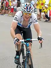 At the Tour de France, Thomas finished sixth on the opening stage to take the white jersey.[42] He retained the jersey the following day, as Sky finished third in the team time trial.[43] Thomas lost the white jersey to Robert Gesink on stage 7, as team leader Bradley Wiggins crashed out of the Tour, and the remaining Sky riders lost time after waiting for him.[44] Thomas won the combativity award on the 212 km (132 mi) stage 12, following an aggressive breakaway 2 kilometres (1.2 miles) into the first Pyrenean stage, that saw him lose control twice on the descent of La Hourquette d'Ancizan.[45] He finished 36th on the stage after being caught by the general classification leaders with 7 kilometres (4.3 miles) to go on the final climb of the day, and rose to 25th overall.[45][46] Thomas signed a new three-year contract with Sky after stage 16.[47] He finished 31st overall in the Tour.[48]