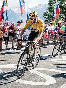 In cycling's grand tours, Thomas was initially a lead domestique to Chris Froome in his victories. He won the first stage of the 2017 Tour de France, an individual time trial, to become the first Welshman to wear the Tour's yellow jersey. He later crashed in that race, as well as in the 2017 Giro d'Italia. Thomas became the first Welsh person to win the Tour de France when he won the race in 2018. He gained the yellow jersey by winning stage 11, extended his lead by winning stage 12, and retained the lead for the remainder of the race. In the same year he won the BBC Sports Personality of the Year Award, becoming the first Welshman to win the award since Ryan Giggs in 2009.[9] In 2019, he confirmed his Grand Tour pedigree when he reached the podium again, having finished runner-up in the Tour de France behind Team Ineos teammate Egan Bernal. In 2022, Thomas became the first Welshman to win the Tour de Suisse and later that year recorded another podium finish at the Tour de France, placing third.[10][11] A fourth grand tour podium, and a first outside of the Tour de France, was won in 2023 as Thomas took second place in the Giro d'Italia, losing the race lead to Primož Roglič on the penultimate day.[12]