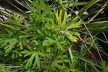 The leaves on the flowering stems are opposite and palmatisect ( leaf cut into lobes to up to more than halfway in a palmate form). They are 1–3 cm long by 1.5–5 cm wide, with 5–10 lobes, and hairy on a stalk (petiole) up to 5 cm long.[5]