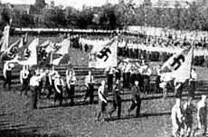 However, Getúlio Vargas' rise to power signified a radical turn in the government's approach to the colonial matter. If until then the Germans had been favored – and had been the preferred people for the government in all settlement projects – now their empowerment generated fears among both the ruling elites and the population at large, and they came under suspicion as different right-wing currents vied for power.[30] This change did not happen suddenly, but when it was institutionalized by the Vargas state it had a severe impact. Since the beginning of the century, some intellectuals were already raising the question of the "German danger," there were conspiracy theories in vogue claiming that the German Empire intended to conquer America or at least annex southern Brazil, and by the beginning of World War I, the much talked about but never proven "German danger" had become, according to René Gertz, "an everyday thing, at least for more or less informed Brazilians."[4]
