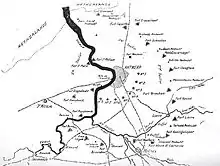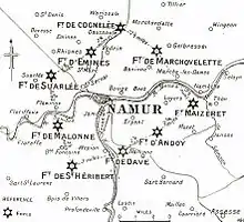 Namur was defended by a ring of modern fortresses, known as the fortified position of Namur (position fortifiée de Namur) and guarded by the Belgian 4th Division. When the siege began on 20 August, the Germans reversed the tactics used at Liège, by waiting until the siege train arrived from Liège and bombarding the forts before attacking with infantry. French troops sent to relieve the city were defeated at the Battle of Charleroi and only a few managed to participate in the fighting for Namur. The forts were destroyed in the bombardment, much of the Belgian 4th Division withdrew to the south, and the Belgian fortress troops were forced to surrender on 24 August. The Belgians had held the German advance for several days longer than the Germans had anticipated, which allowed Belgium and France more time to mobilise.[19] The Belgian army had c.15,000 casualties of whom c.10,000 were from the 4th Division, which was moved to Le Havre and then by sea to Ostend on 27 August, from where it re-joined the field army at Antwerp.[20] Der Weltkrieg, the German official history recorded the taking of 6,700 Belgian and French prisoners and twelve field guns, and 900 German casualties, of whom c.300 were killed.[21]