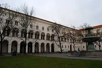 48°09′02.68″N 11°34′50.25″E / 48.1507444°N 11.5806250°E / 48.1507444; 11.5806250 Geschwister-Scholl-Platz (Scholl Siblings Plaza) is a short semi-circular plaza located in front of the main building of the Ludwig Maximilian University of Munich (Ludwig-Maximilians-Universität München), located on the Ludwigstraße in Munich, Germany.[1] The plaza is named in memory of Sophie Scholl and her brother, Hans Scholl, students at Ludwig Maximilian University of Munich during World War II who were among the founding members of the White Rose (Weiße Rose) resistance movement. They were the Geschwister Scholl (Scholl Siblings).[2]