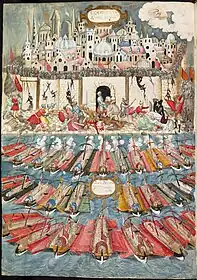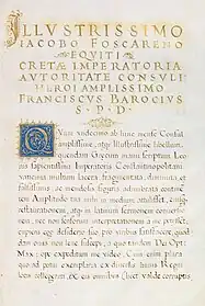 In 1577, Foscarini commissioned the local scholar Francesco Barozzi to take a census of the island. He also commissioned him to translate the Oracles of Leo the Wise from Greek into Latin. He commission the local scribe and artist Georgios Klontzas to produce two lush illuminated manuscripts of the text, the Bute Manuscript (today in a private collection) and Oxford, Bodleian Library, MS Barocci 170. The former, the apparently unfinished presentation copy, was made in Heraklion between April 1577 and March 1578.[7] The unfinished presentation miniature is missing Foscarini's portrait, but does include an angel holding the ducal hat positioned above the blank space, a strong indication that Foscarini had ducal aspirations. He had been a candidate for doge in 1578 and would be again in 1585 and 1595.[8] The whole project of translating and illustrating the Oracles was a work of propaganda that altered the meaning of the text to prophesy Christian victory against the Ottomans.[9]