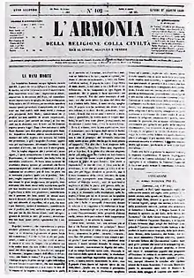 Although inspired by principles essentially conservative, L'Armonia was originally somewhat moderate due to the presence of representatives of liberal Catholicism. Throughout 1848 the paper followed the events of the war against Austria while maintaining a patriotic attitude in support of the monarchy and calling priests to their duties as citizens in defense of the country.[1]