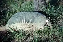 The giant armadillo (Priodontes maximus), colloquially tatu-canastra, tatou, ocarro or tatú carreta, is the largest living species of armadillo (although their extinct relatives, the glyptodonts, were much larger). It lives in South America, ranging throughout as far south as northern Argentina.[3] This species is considered vulnerable to extinction.[1]