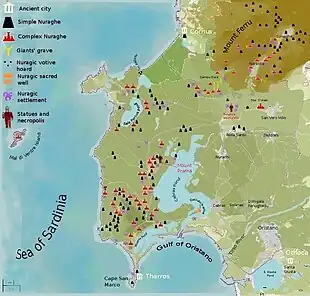 During this period the trading of oxhide ingots between Cyprus and Sardinia also began. This exchange of ingots lasted until the end of the Bronze Age.[45][46] The Sinis peninsula is considered to have been an important metallurgic area, given the proximity of Montiferru, controlled by numerous nuraghes.[34][37]