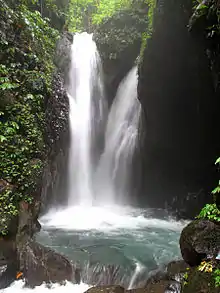 Gitgit Waterfall is a waterfall on Bali, Indonesia. It is located on the north of the Southeast Asian island between the old island capital of Singaraja and the inland village of Munduk.[1] The waterfall is a popular tourist destination in Bali, known for its height and the surrounding foliage and natural swimming pools, accessible by a rocky walking trail. The falls are located in Gitgit Village in the Sukasada District, around 10 kilometres (6.2 mi) from Singaraja, 26 kilometres (16 mi) from Munduk and 83 kilometres (52 mi) from Denpasar's Ngurah Rai International Airport.