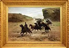 In Rome, he met the painter of agrarian subjects, Nino Costa.[1] While he continued to paint some religious subjects such as a Holy Family (1854, Genoa) and a Samaritan (1862), Raggio by 1860 favored scenes of cattle farming in the Lazio countryside sa subject matter for his paintings. His Bufali (1860) at the Palazzo Pitti in Florence marks this change. In 1865 at Dublin, he exhibited Campagna Romana.