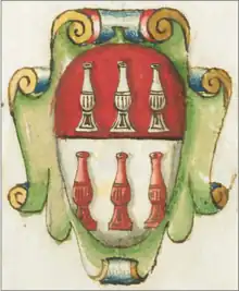 ![]() Coat of arms for Giovanni Battista Giusti di Colle Val D'Elsa from 1571, found in Palazzo della Caravan (Pisa). |
