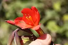The mostly six to fourteen flowers are set in a spike, each subtended by two green to dark purple flushed bracts, which are usually 4 cm long at the low end and 1½5 cm at the tip of the spike. The flowers are scarlet red, with some yellow on the inside, and green on the outside, near the base in a fresh flower. The tube, where the tepals are still merged, is erect, slender and cylindrical at the base where it is enclosed in the bracts, and this part is mostly 1½2 cm long. It expands rather abruptly into a funnel-shaped upper part at a right angle with the stem of usually 1½–3 cm long and ½¾ cm wide. The free parts of the tepals are not equal, the one furthest from the stem being slightly longer, ovate in shape, and usually 2½ cm long and 1¼2⅓ cm wide. The tepals spread at approximately 45° from the flower axis. The filaments of the stamens are usually 1¾ cm long, the free ends usually 1 cm, carrying the yellow usually 1 cm long anthers. The style divides into three whitish branches, each 3½–5 mm long, usually beyond the tip of the anthers. The fruit capsules are spheres to inverted egg-shaped, usually 2½3 cm long.[1] In its home range, most flowers can be seen from August to November, but flowering occurs throughout the year.[3]