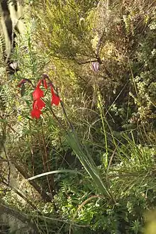 Gladiolus watsonioides is a medium to high, roughly ½1 m, herbaceous geophyte with sword-shaped leaves, flattened in the plain of the stem, with spikes of red, curved, funnel-shaped, slightly bilaterally symmetrical flowers. Although G. watsonioides has underground storage, green plants can be seen all year round, due to the very even climate, with warm days and cold or frosty nights all year round.[1][2]