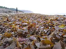 The southern part of Glatved Beach is dominated by a man made plain, originating from limestone extraction going back at least 150 years.[1] The plain consists of now fairly levelled out heaps of stones, that up until the fifties where dumped from rail-wagons coming from an industrial lime kiln at the southern end of the beach, after the lime-stones had been sorted out.[1] The kiln was placed at the end of Katholm Strandvej. In the sea out from Glatved Beach, are the remains of a 65-million-year-old cold water coral reef, consisting of a limestone formation with layers of flint.[1] This reef is the source of the stony coast of Glatved, and the hills behind. This underground lime-formation stretches throughout the Danish underground, and is also exposed at The Cliffs of Møn (Møns Klint) on the south-eastern island of Denmark, Møn.[1] Here there are coastal cliffs similar to the Cliffs of Dover in England. The formation also surfaces as The Cliffs of Sangstrup, Sangstrup Clint, 20 km north of Glatved Beach in the middle of Denmark, and again in the northern part of the country south of the town, Aalborg. Here the lime is extracted as an ingredient for cement production. The industrial lime kiln at Glatved Strandvej was torn down around year 2000. At the furnace here, limestone was burned and converted into calcium oxide, burnt lime, which in the form of slaked lime was used for mortar production and for white washing of buildings - a widespread surface treatment for masonry in the past, seen on traditional white washed Danish country Churhes, and on many old and white washed farms and houses in the Danish countryside.[1] Today only gravel and stones are extracted from the hills behind Glatved Beach. At the end of Glatved Strandvej is a pier for embarkment of this raw material.