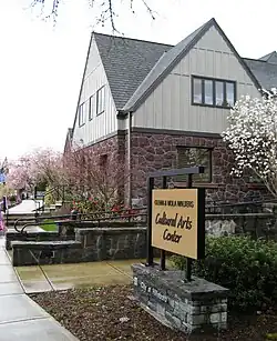 Renovations included adding a new roof, creating a new entrance, adding an elevator, among other changes.[5] Creating a new entrance involved removing hand quarried stone from the walls to enlarge a window opening.[10] The remodeling also brought the building up to modern seismic codes and to comply with the Americans with Disabilities Act (ADA).[5] City officials hoped to maintain the character of the original structure despite changes and upgrades.[5] The total cost for renovations as of opening were $2.4 million, with the city paying for 60% of those costs.[8] Some financing for the center came from selling bricks to the public that were then used on exterior spaces.[5][7]