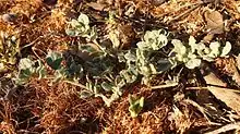 It is a prostrate to somewhat upright annual herb with a stem up to about 30 or 35 centimeters long and coated in feltlike whitish hairs. The oval or spade-shaped leaves are located in whorls about the stem. Each is a few millimeters to 3 centimeters long. The inflorescence is a tight cluster of five to ten small flowers. Each flower has five woolly sepals and no petals. The fruit is an oval capsule about four millimeters long.