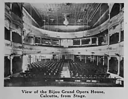 The original wooden opera house was established in 1827. In 1906, the house, then known as Bijou Grand Opera House, was sold by E. H. Ducasse to E.M. Cohen. Cohen renamed it Grand Opera House. Later it was converted into a theatre hall and named Globe Cinema.[1] This was one of the first few theatres in Calcutta which regularly screened English movies.[4]