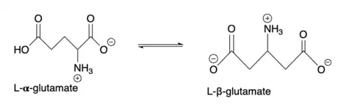 Based on high performance liquid chromatography (HPLC) and electron paramagnetic resonance (EPR) spectroscopy techniques, the subsequent proposed glutamate 2,3-aminomutase reaction scheme is shown below:[2]