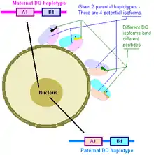- ↑ HLA-DQ8 generally refers to DQ8.1, DQA1*0301:DQB1*0302 but DQA1*0301 and DQA1*0303 can produce the same functional isoform, rarely DQA1*0503 is in the DQ8 haplotype, it has no known association with disease