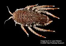 Glyptonotus antarcticus has a typical maximum length of 9 cm (3.5 in),[2] but may rarely reach up to 20 cm (8 in).[3][4] This is large for an isopod, most of which are between 0.5 and 1.5 cm (0.2–0.6 in) in length.[5] It has two pairs of compound eyes, a large pair on the dorsal surface and a smaller pair on the ventral surface. Glyptonotus antarcticus has only five ommatidia, which is unusual for crustaceans and insects.[6] It is thought that the latter are useful when the animal is swimming, which it does in an upside-down position.[6] With the exception of the eyes, certain mouthparts and feet, the whole surface of the animal has minute cuticular outgrowths of feathery hairs and knobbly scales. It is thought that these may help to prevent attachment of Foraminifera and marine larval organisms on the body surface.[7]
