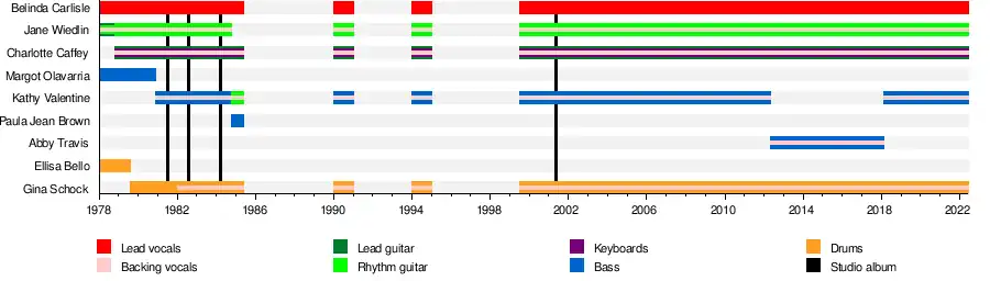 • Belinda Carlisle – lead vocals, percussion (1978–1985, 1990, 1994, 1999–2022)