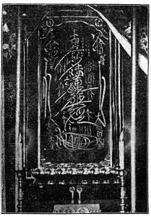 Early photograph of the Dai-Gohonzon at Taisekiji Temple. Printed in Kumada Ijō's book Nichiren Shōnin (1913).[46] This mandala is the artistic source of transcribed gohonzon copied both in Nichiren Shoshu, Kenshokai and Soka Gakkai.