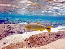 Salminus brasiliensis (dourado, dorado, golden dorado, river tiger or jaw characin) is a large, predatory characiform freshwater fish found in central and east-central South America.[2] Despite having Salminus in its name, the dorado is not related to any species of salmon,[3] nor to the saltwater fish also called dorado. It is very popular among recreational anglers and supports large commercial fisheries.[4]